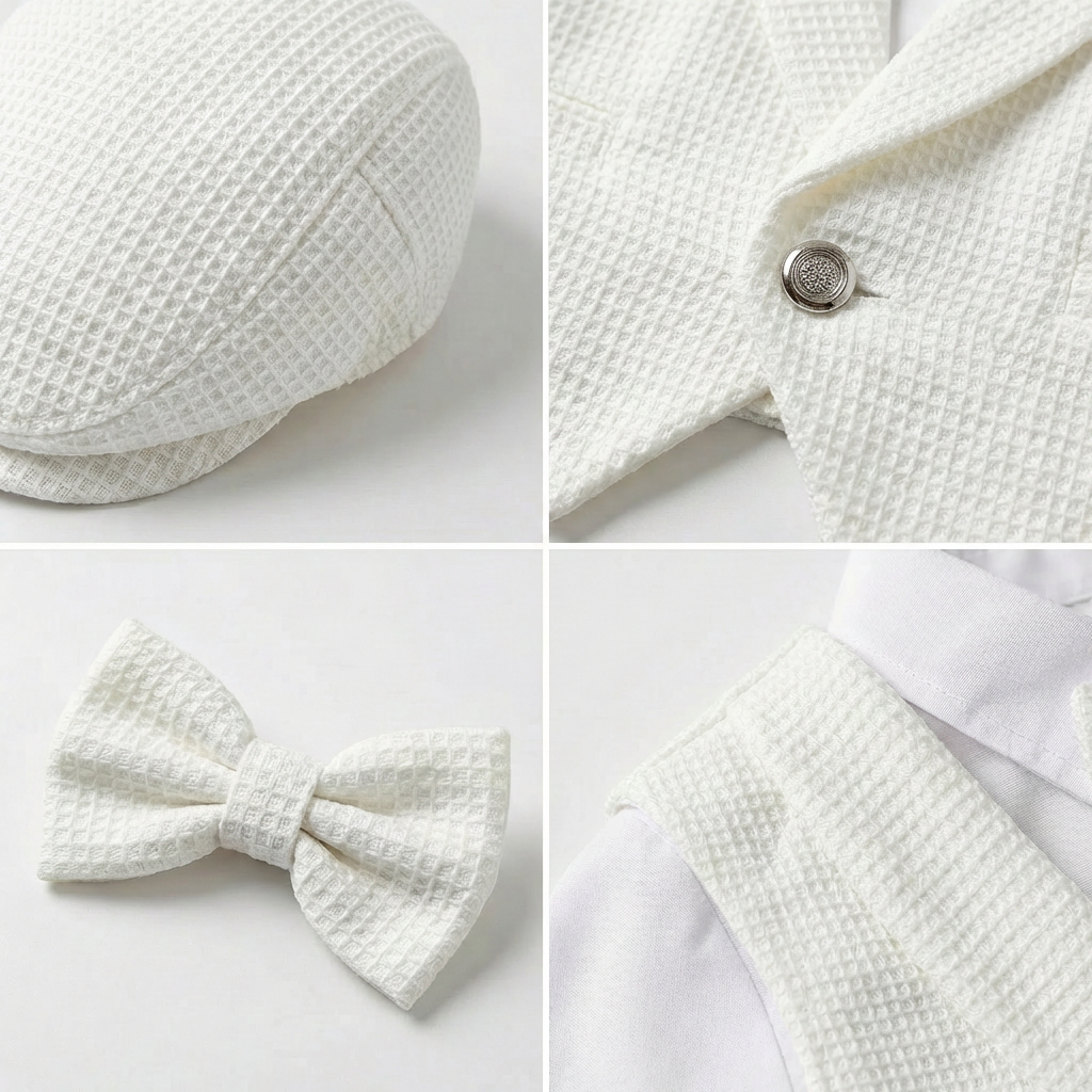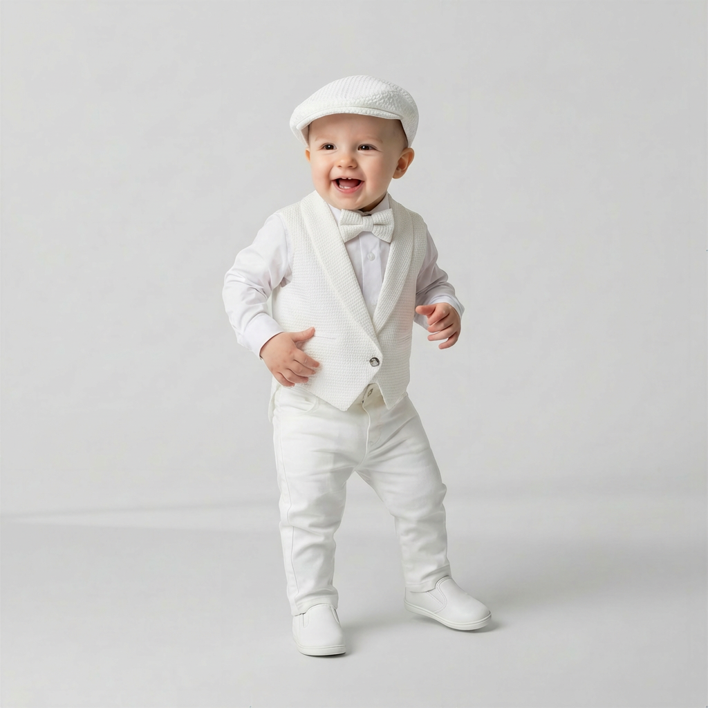 Embrace elegance and comfort on your special day with this stylish baptism set. Featuring a trendy, UK-inspired design, this set includes a white cotton shirt, a penguin tail sleeveless vest adorned with a tone on tone jacquard pattern, a matching bowtie, slim pants and matching beret. Make a statement with this must-have ensemble.