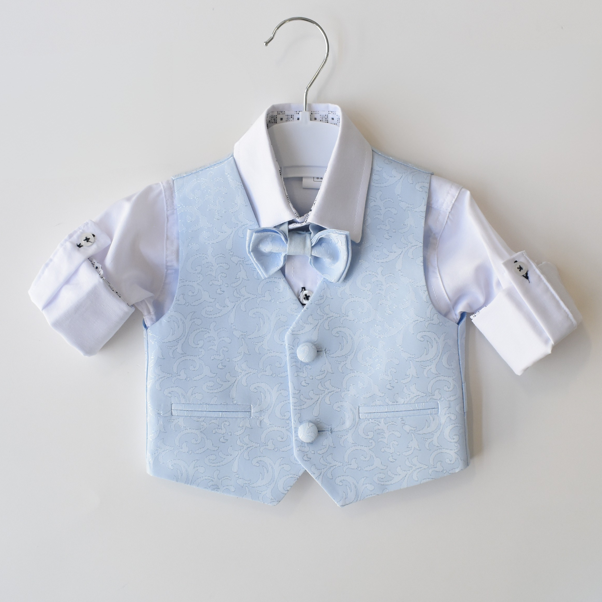 Make a statement on your special day with this stylish baptism or wedding day suit. It boasts a trendy, European-inspired look that exudes both elegance and comfort. This boys' suit set includes a white cotton shirt, a sleeveless vest with a jacquard pattern (jacquard print may vary from the sample picture), a matching jacquard bowtie, and a soft baby blue blazer, and adjustable waist pants. This thoughtfully coordinated boys' dress suit set is made of 100% cotton, ensuring breathability and comfort.