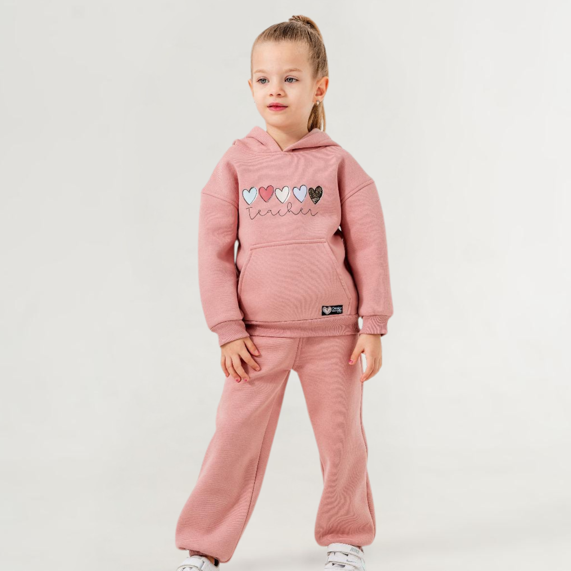 Roomy hood and elastic-hem waistband for a snug, stay-put fit. Center-front kangaroo pocket and multicolor heart-print “Teacher” design add sweet charm.