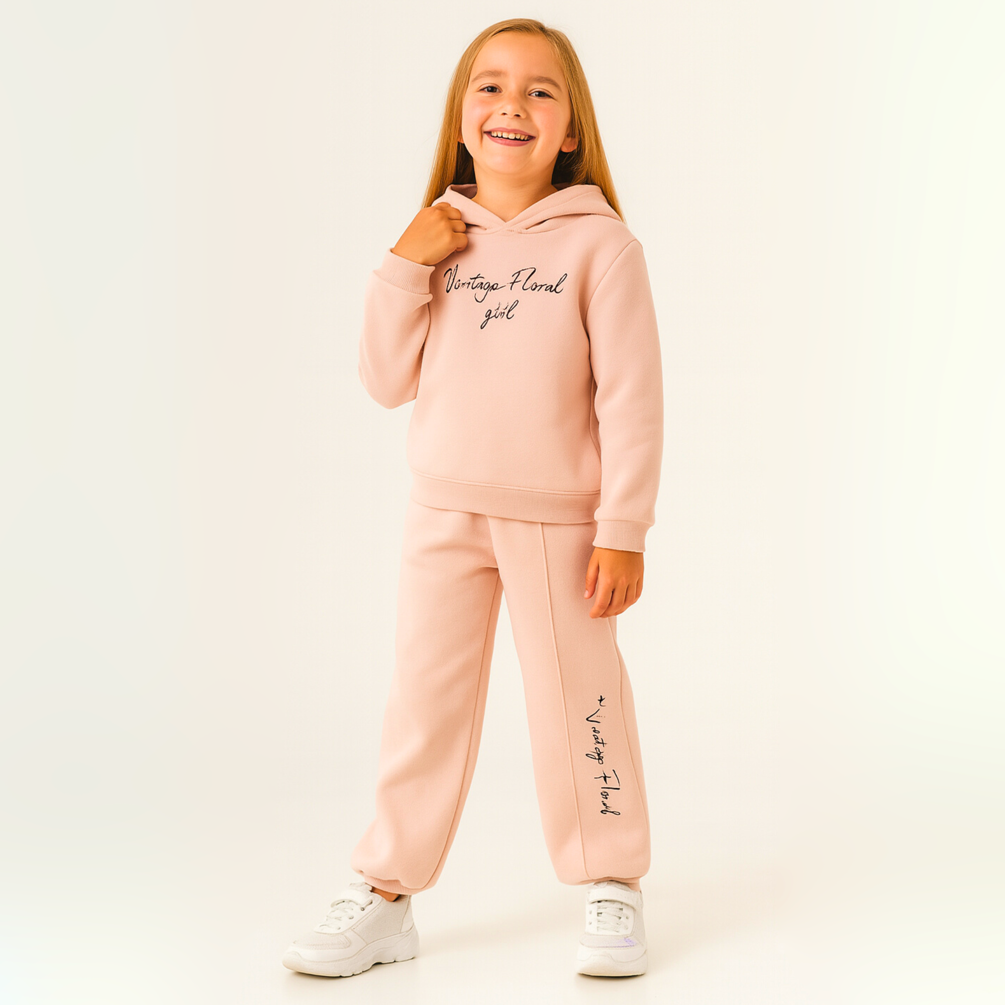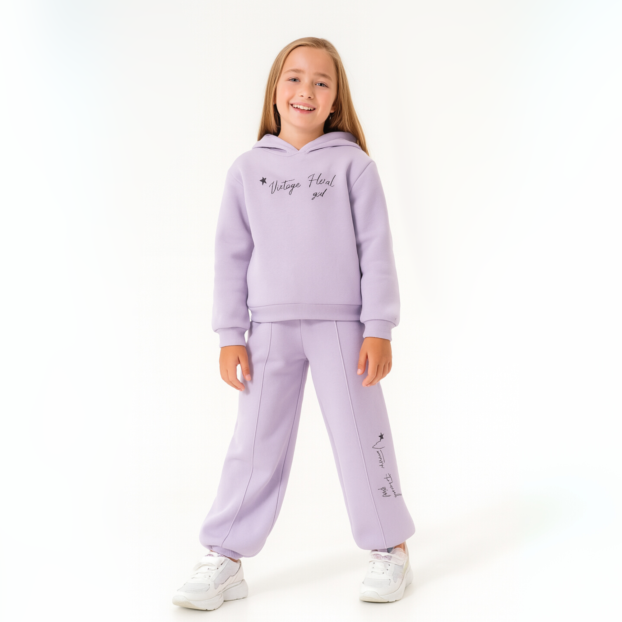 A fashion-forward loungewear duo for girls ages 6–9, this set pairs a sculptural hooded pullover with matching jogger pants—perfect for school, playdates, or cosy weekends at home.
