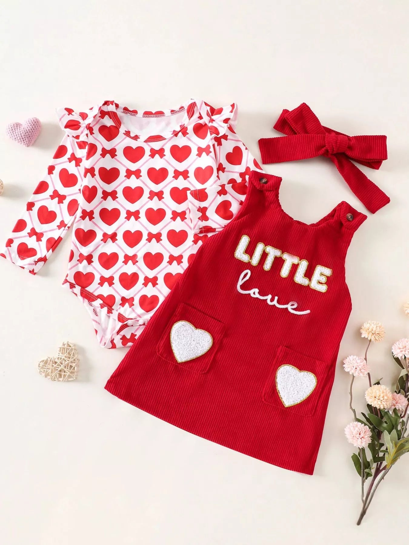 Children's Heart Print Bodysuit and Dress Outfit Set with Headband