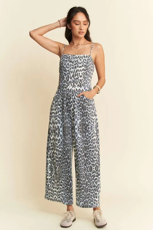 Davi & Dani Leopard Spaghetti Straps Wide Leg Jumpsuit