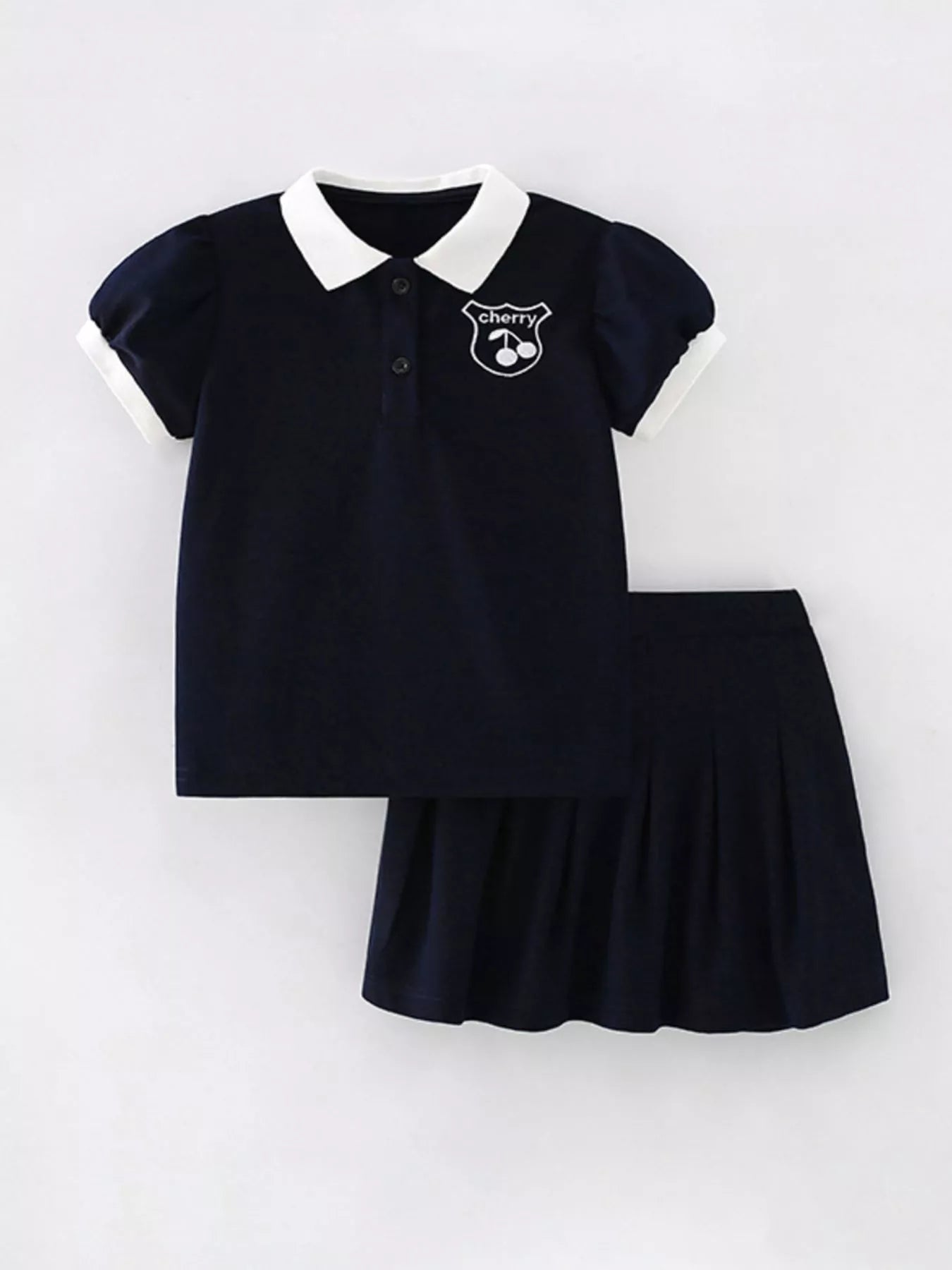 Children's Cherry Embroidered Polo Shirt and Pleated Skirt Set