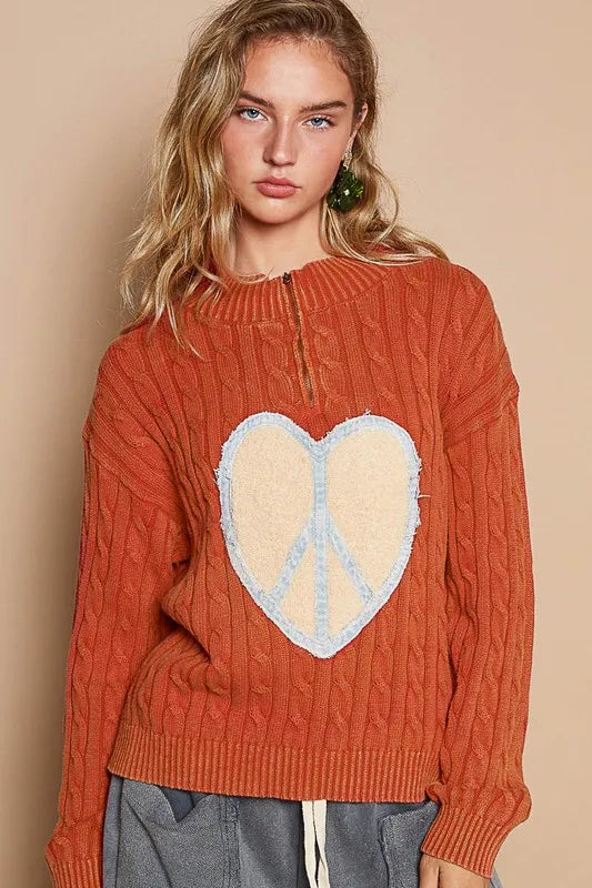 POL Cable-Knit Peace Patch Dropped Shoulder Sweater