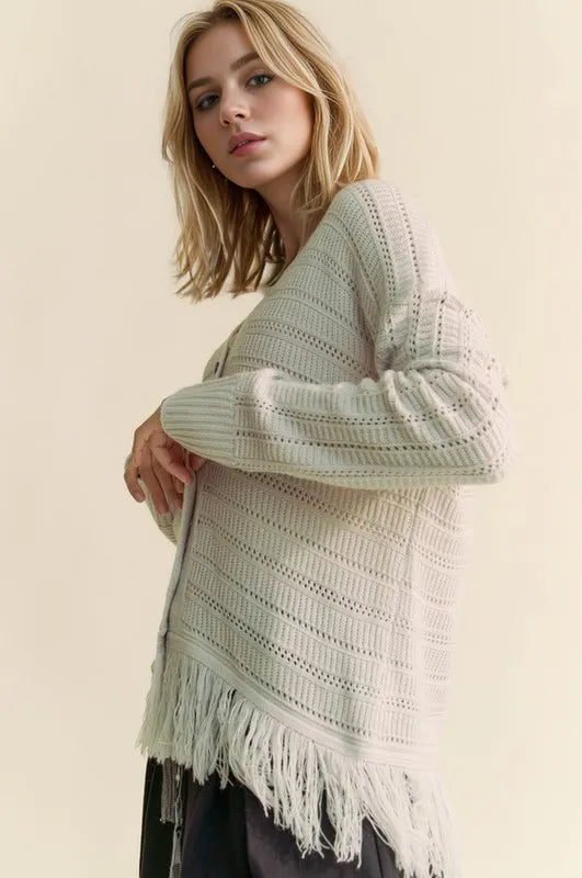 Davi & Dani Fringe V-Neck Button Up Long Sleeve Cardigan
