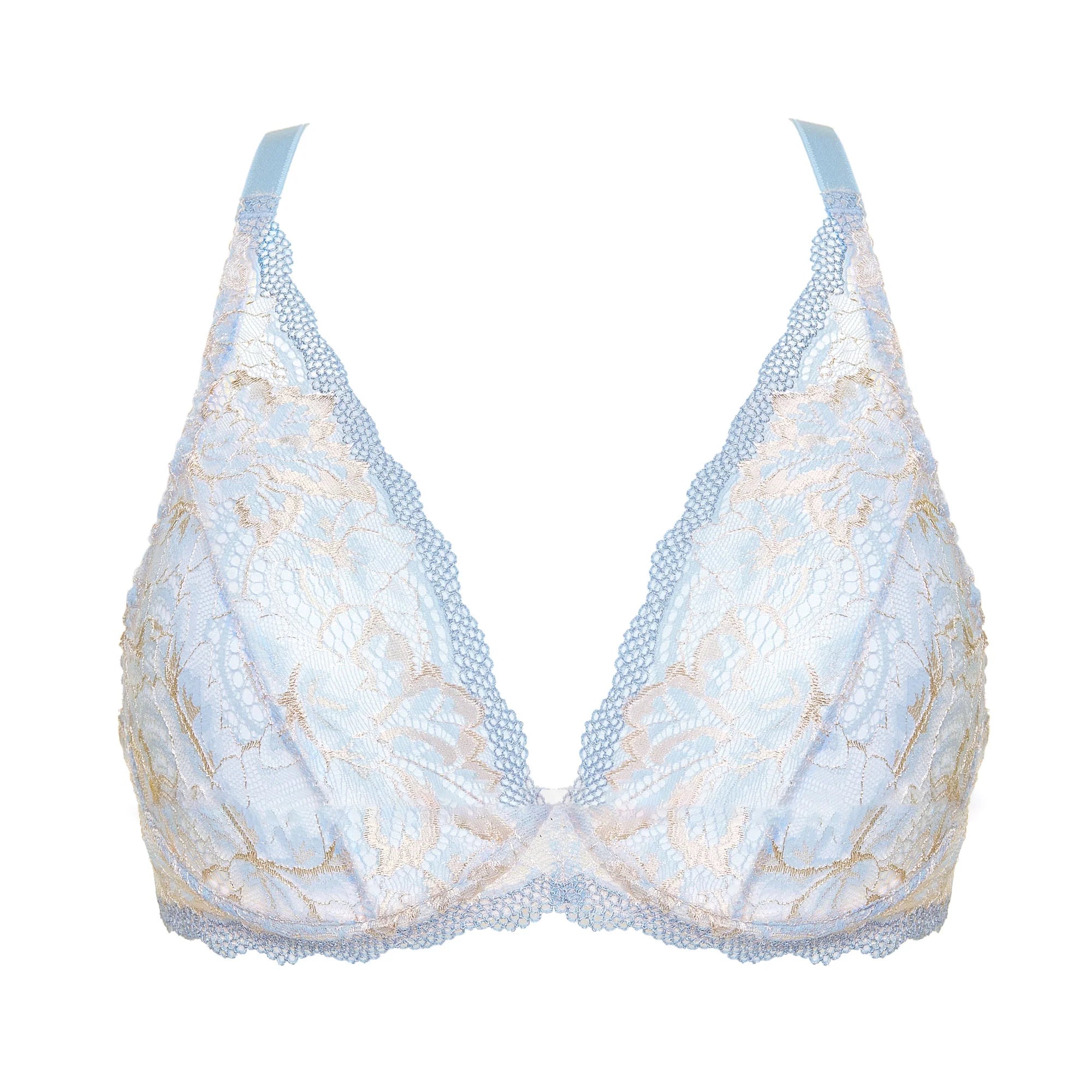 Elevate your summer style with the Soft See-Through Deep Plunge Bra Gorteks Lingerie. Its charming combination of baby blue and beige hues creates a perfect proposition for the sunny season. With triangle cups crafted from shiny lace adorned with a delicate floral pattern, this bra embodies elegance and allure.
