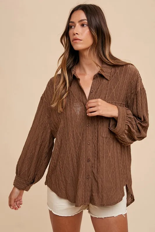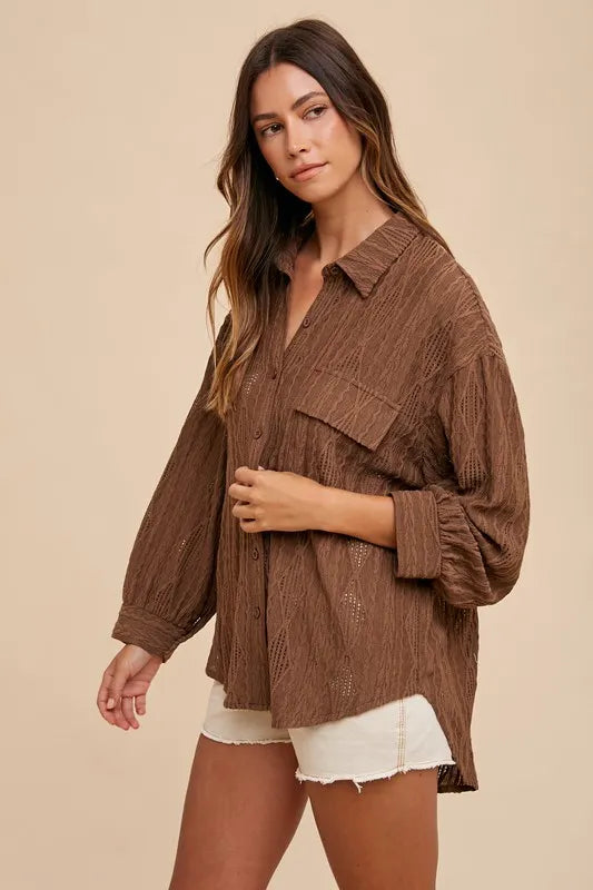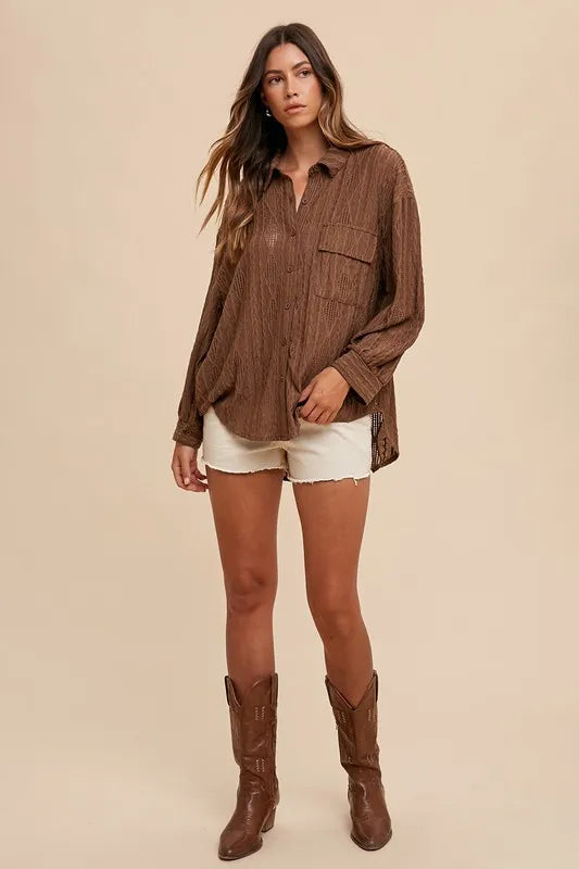 Annie Wear Openwork Button Down Drop Shoulder Shirt