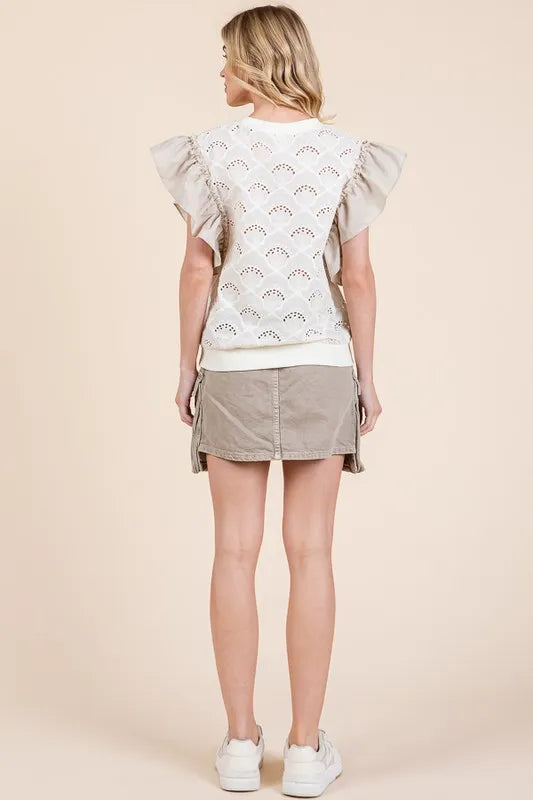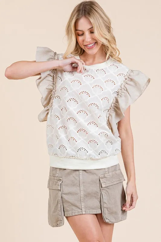 Lime 'N' Chili Ruffle Cap Sleeve Embroidered Eyelet Blouse