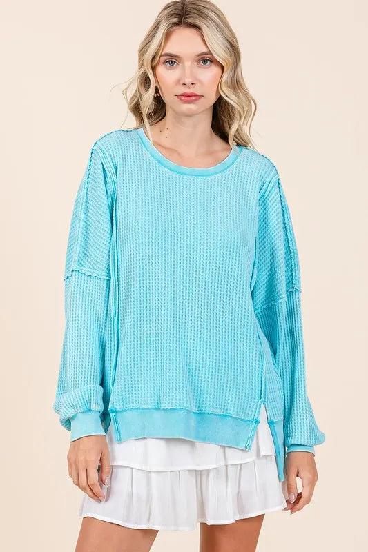 This Mittoshop Mineral Wash Waffle Long Sleeve Sweatshirt features a premium waffle knit construction with a unique mineral wash treatment that creates a beautifully faded, vintage-inspired appearance. The oversized relaxed fit offers ultimate comfort and on-trend styling, while the dropped shoulder design and distressed raw hem add contemporary edge. Made from soft, breathable cotton blend fabric, this pullover is perfect for layering or wearing solo. The classic round neckline and long sleeves provide versatile styling options, making it ideal for casual everyday wear, lounging, or creating effortlessly chic layered looks.