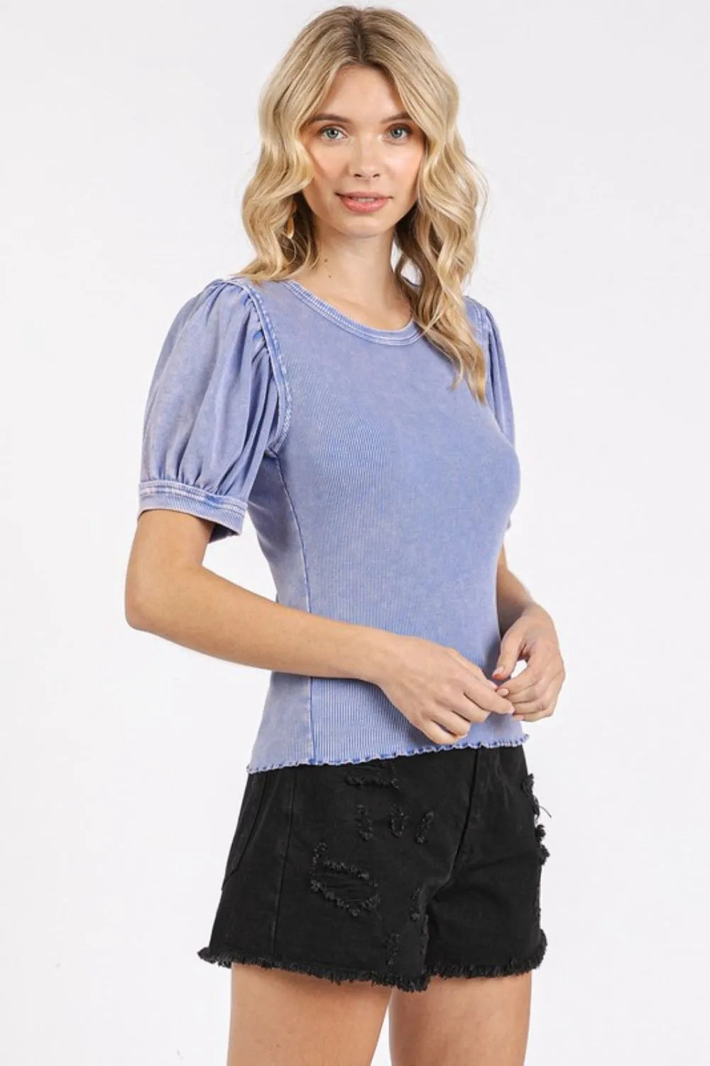 Mittoshop Mineral Wash Puff Sleeve Rib Knit Top