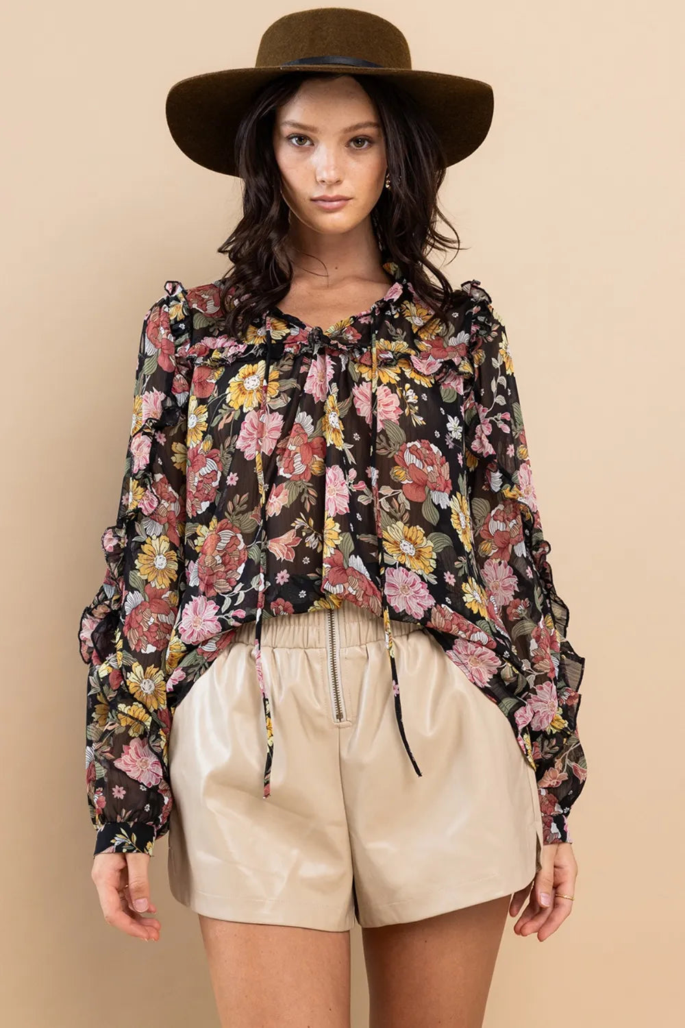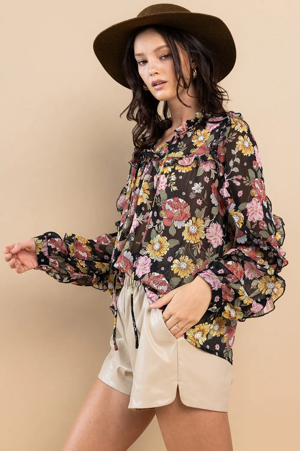 Ces Femme Ruffle Trim Long Sleeve Floral Blouse