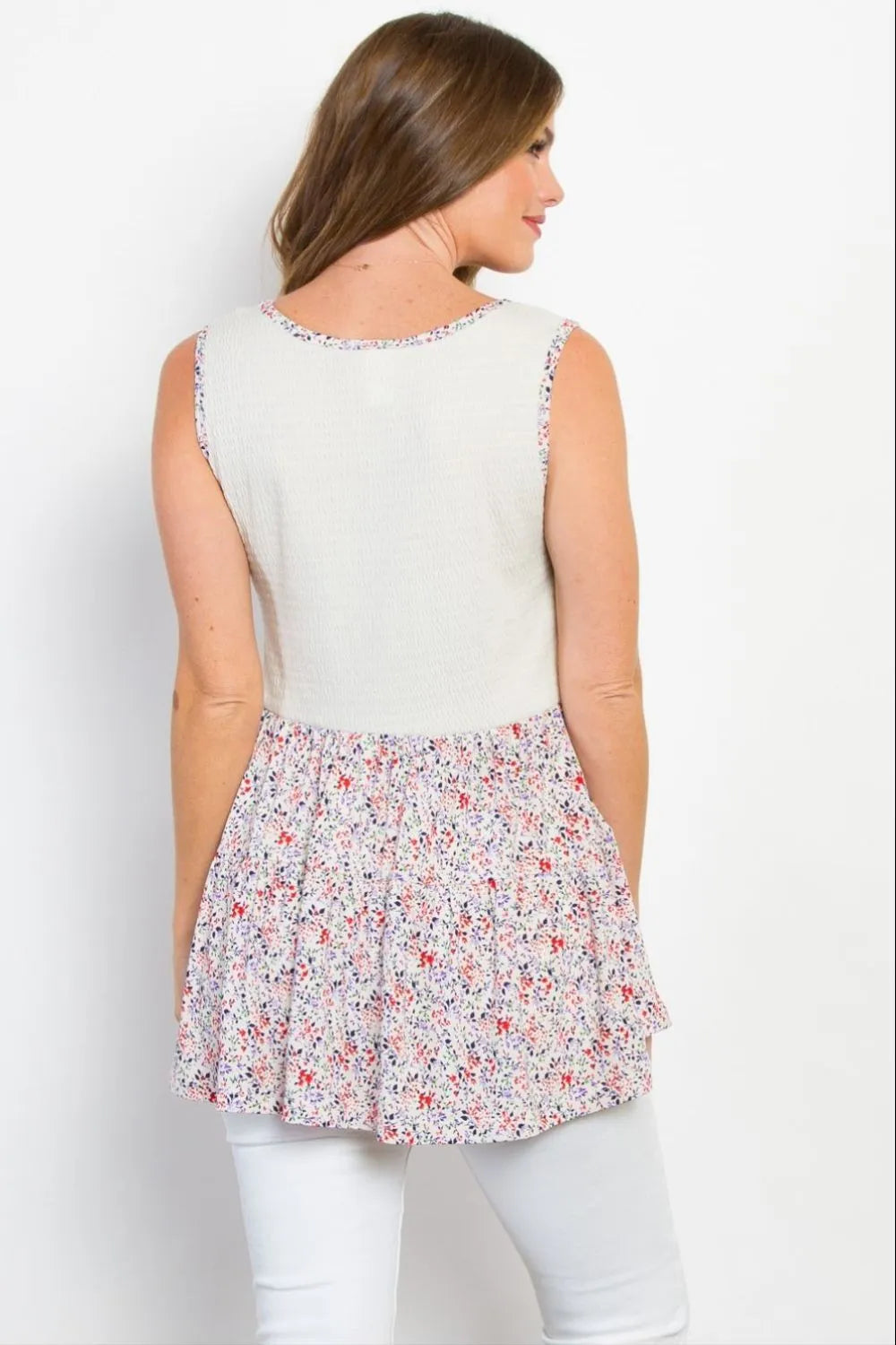 Be Stage Full Size Smocked Printed Peplum Sleeveless Top