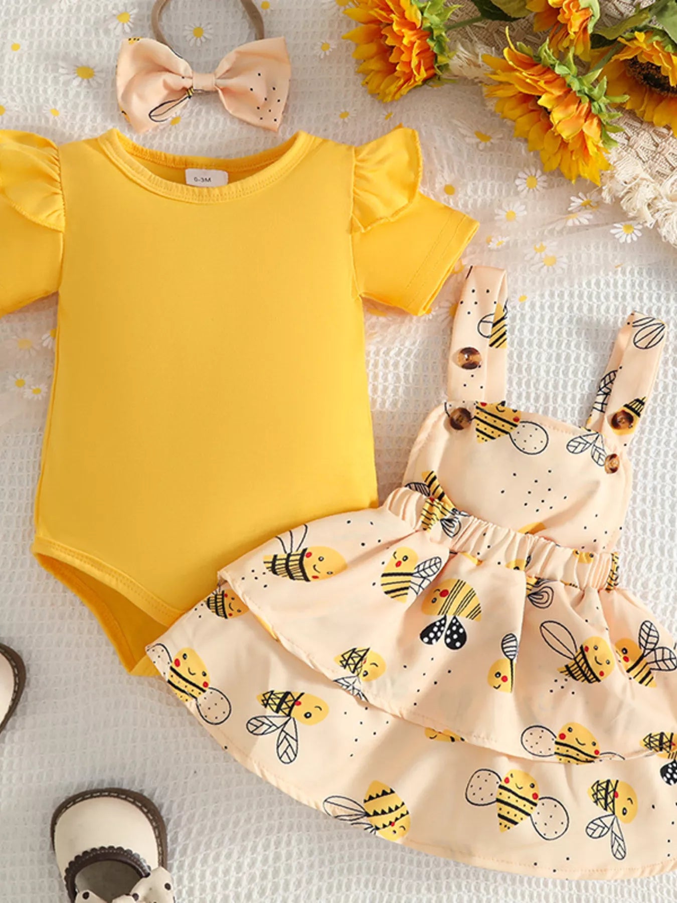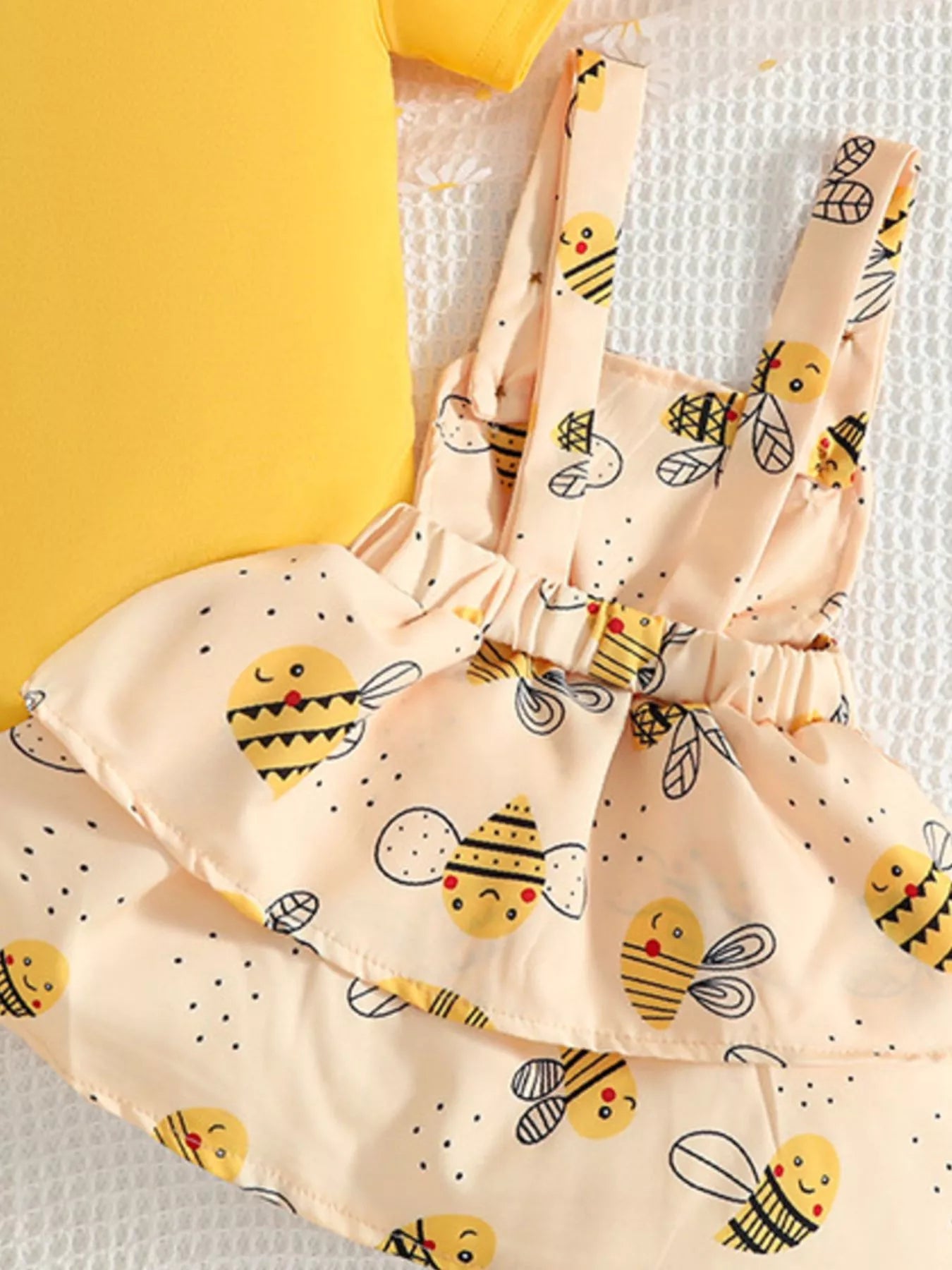 Children's Ruffle Trim Bodysuit and Bee Print Dress Set with Headband