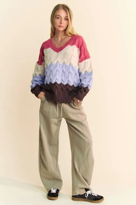 Davi & Dani Wavy Texture Color Block V-Neck Sweater