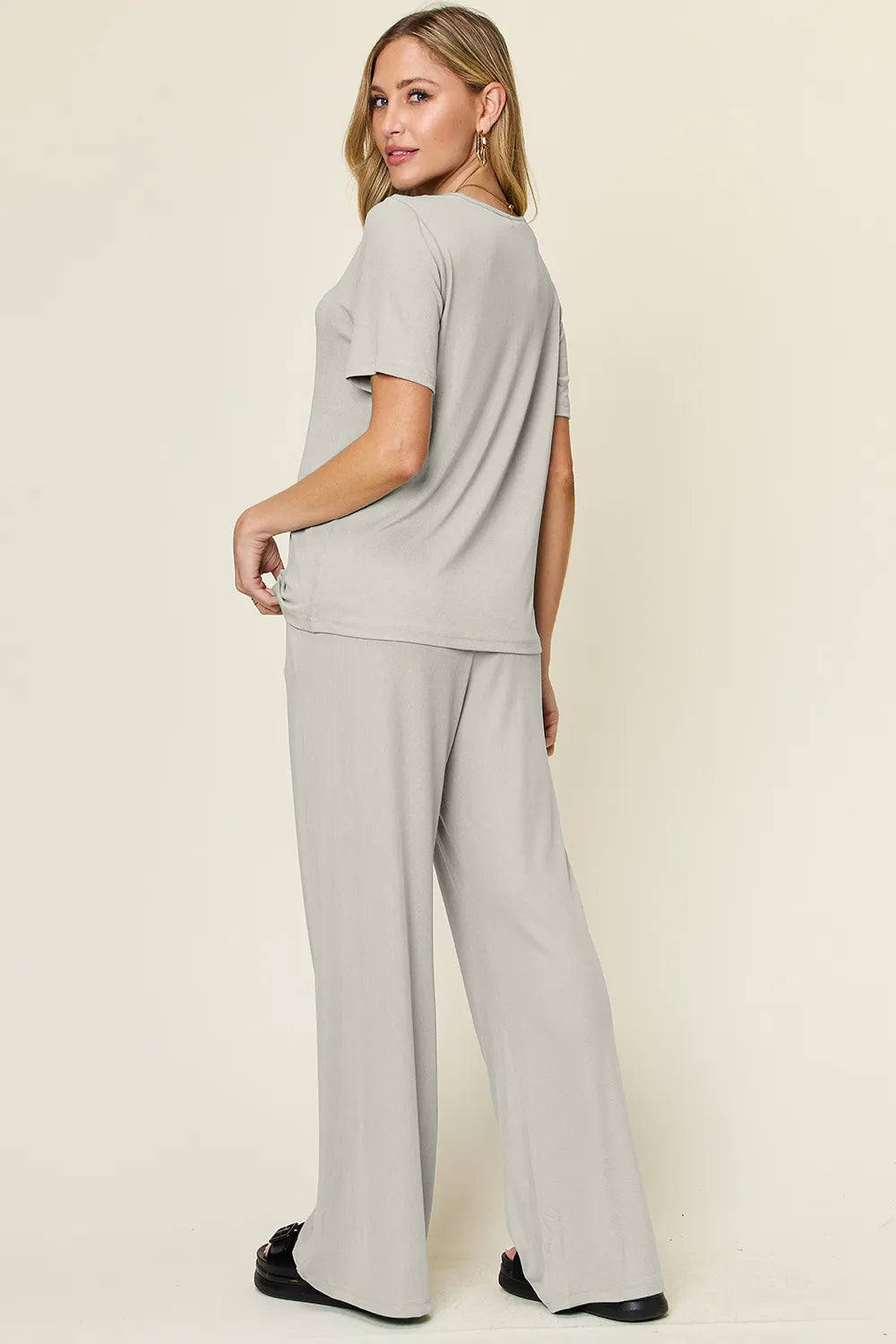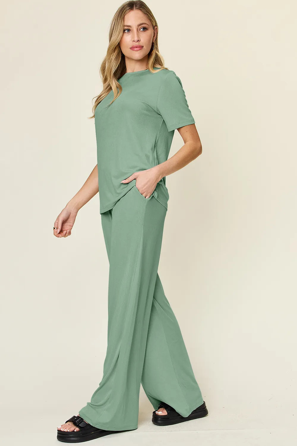 Double Take Full Size Round Neck Short Sleeve T-Shirt and Wide Leg Pants Set