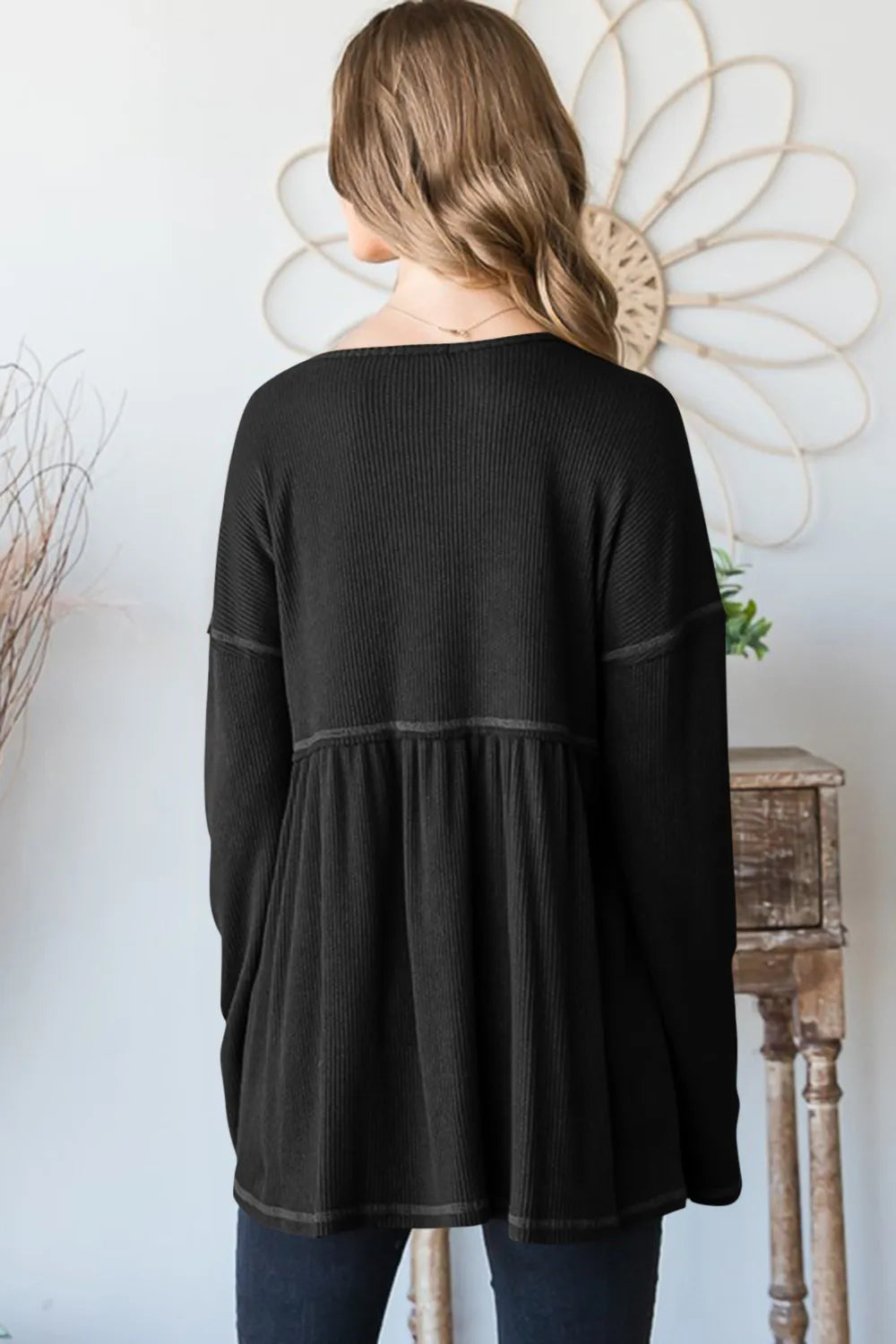 Heimish Full Size V-Neck Long Sleeve Ribbed Babydoll Top