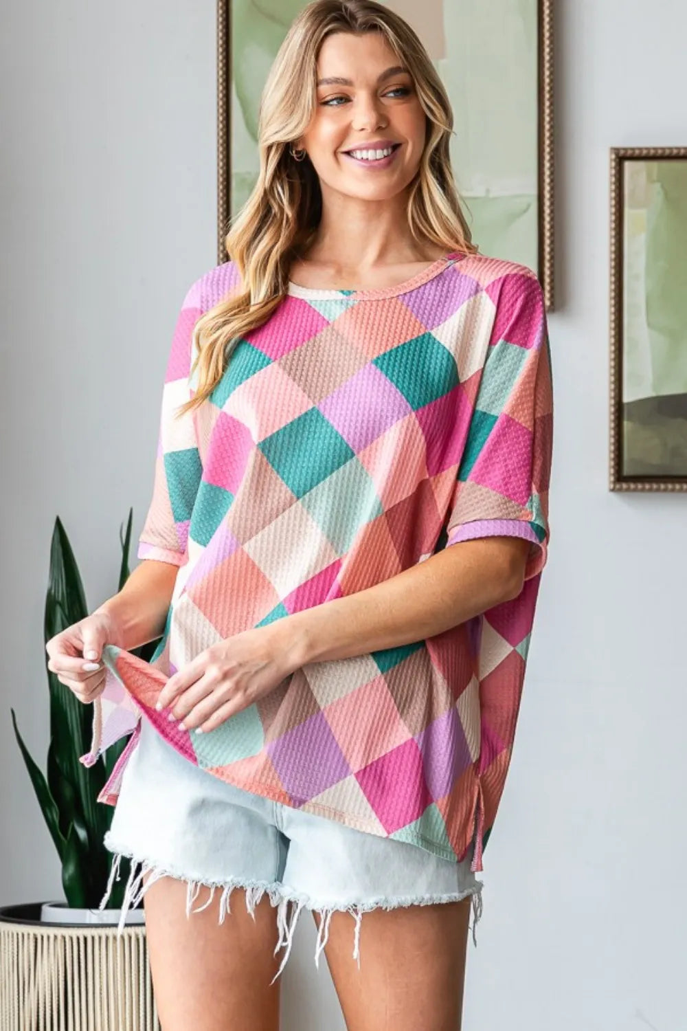HOPELY Full Size Multi Colored Argyle Side Slit T-Shirt