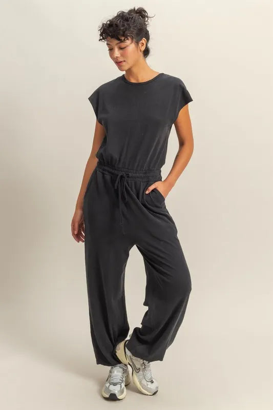 HYFVE Back Keyhole Round Neck Cap Sleeve Drawstring Jumpsuit