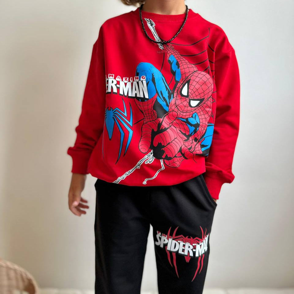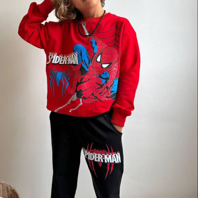 This two-piece superhero set is designed for comfort and bold style. The crewneck sweatshirt features a large action graphic, paired with jogger pants carrying matching details for a coordinated look. Made from 100% soft cotton, the outfit is breathable, cozy, and gentle on the skin — perfect for school, play, or relaxing at home.
