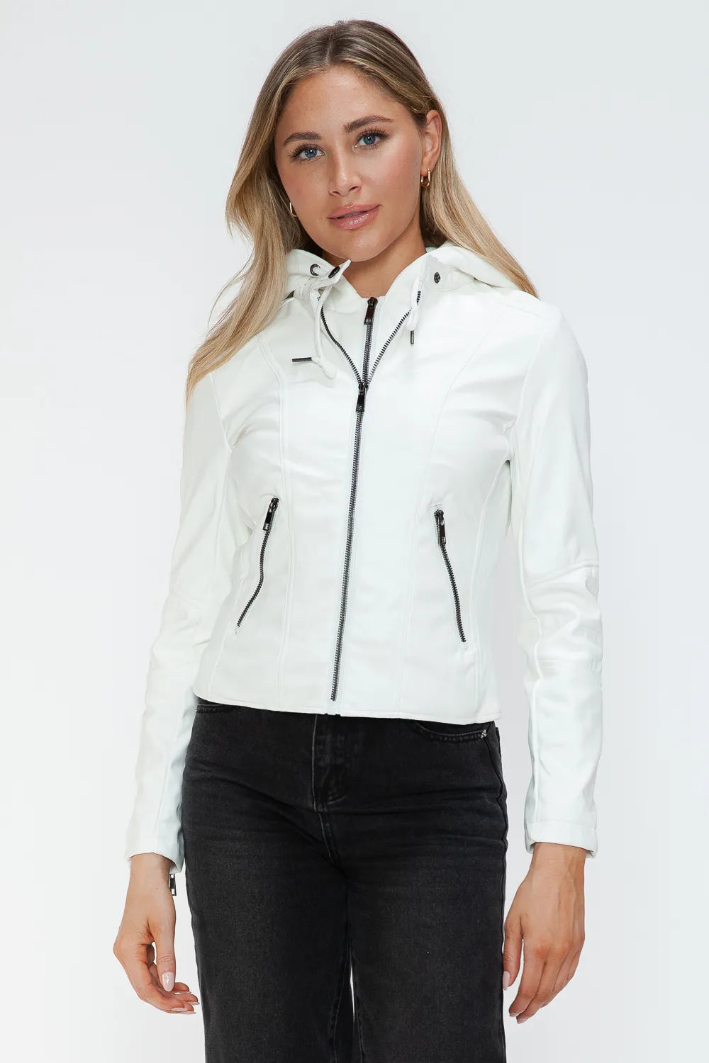 Snobbish Faux Leather Zip Up Drawstring Hooded Jacket