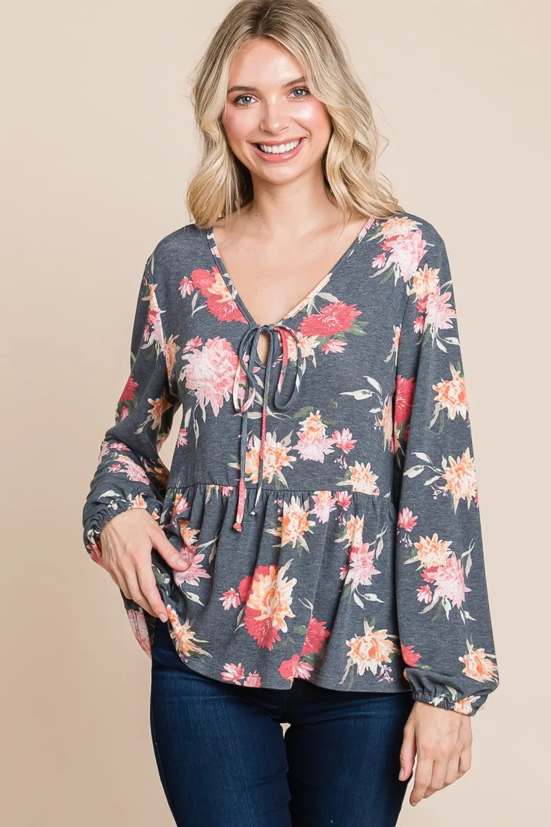 Super Lady Full Size Babydoll Floral Long Sleeve Blouse