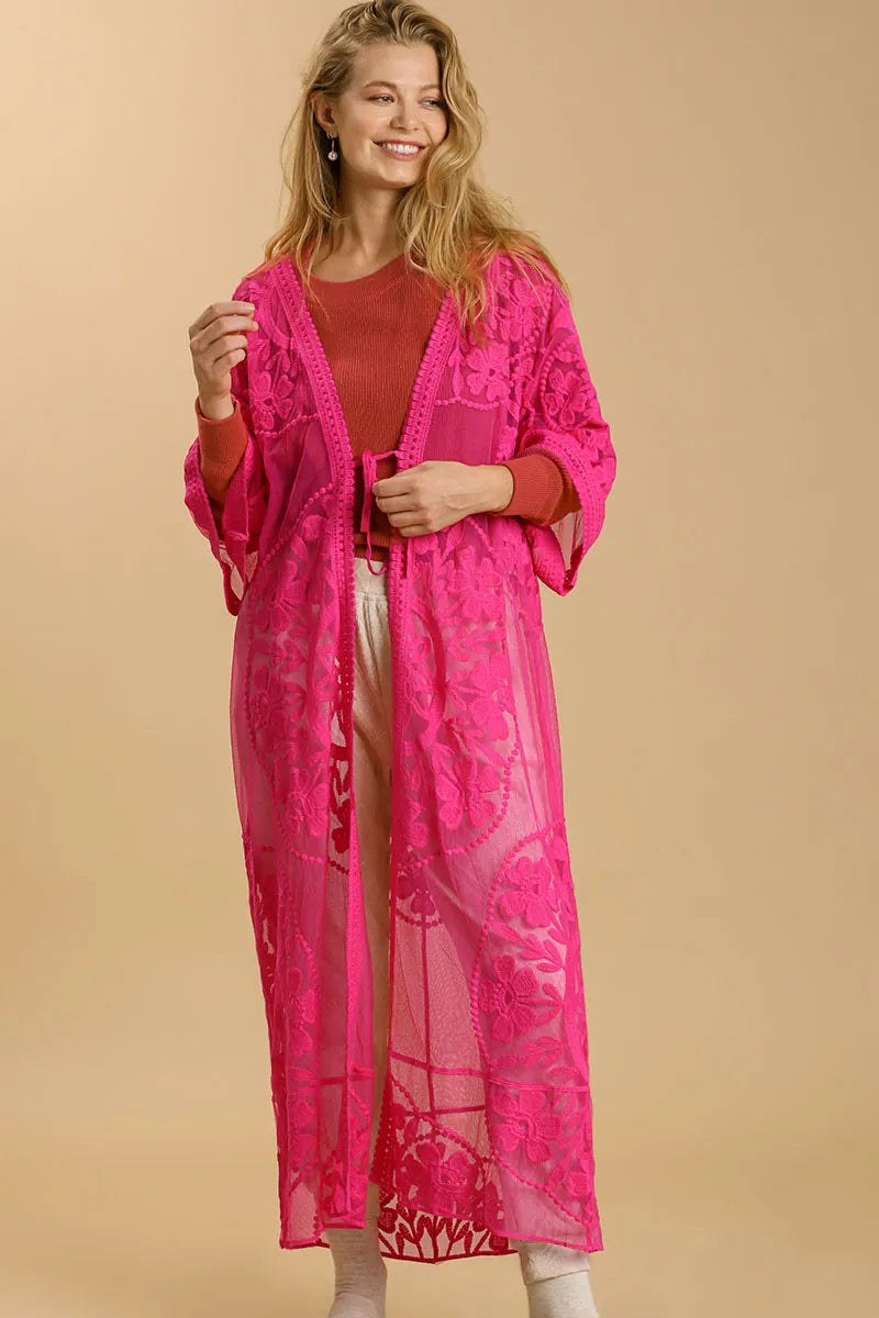 Umgee Full Size Floral Lace Open Front Long Kimono with Waist Tie Plus Size
