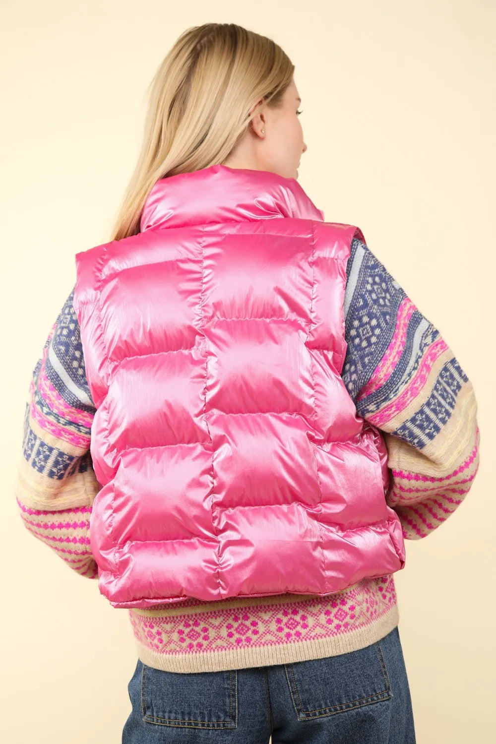 VERY J Shiny Metallic Zip Up Puffer Vest