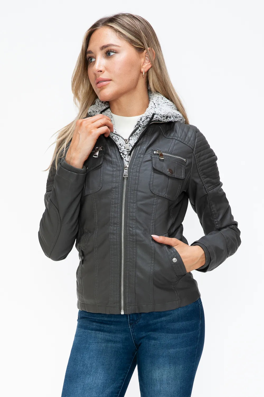 YMI Removable Faux Layered Multi-Pocket Jacket with Fuzzy Hood