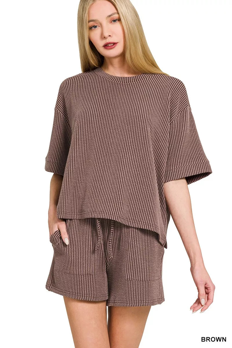 Zenana Raised Rib Short Sleeve Tee and Drawstring Shorts Set